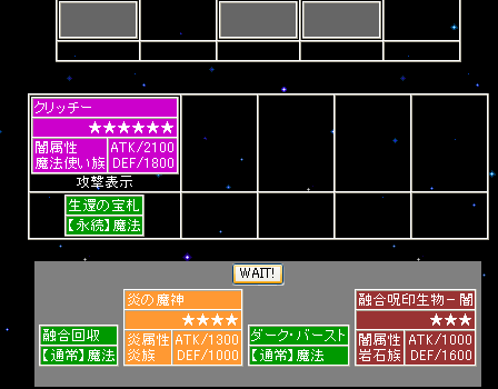 使えるのはクリッターと攻撃力1000以下の融合代用モンスターと炎の魔神のみ。